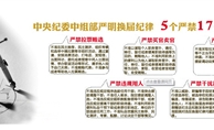 “5個(gè)嚴(yán)禁”“17”個(gè)不準(zhǔn)”和“5個(gè)一律” “5個(gè)嚴(yán)禁”:  嚴(yán)禁拉票賄選、嚴(yán)禁買官賣官、嚴(yán)禁跑官要官、嚴(yán)禁違規(guī)用人、嚴(yán)禁干擾換屆“17個(gè)不準(zhǔn)”:  1、不準(zhǔn)在民主推薦、民主測評、組織考察和選舉中搞拉票等非組織活動(dòng),通過宴請、安排消費(fèi)活動(dòng)、打電話、發(fā)短信、當(dāng)面拜訪、委托或者授意中間人出面說情、舉辦聯(lián)誼活動(dòng)等形