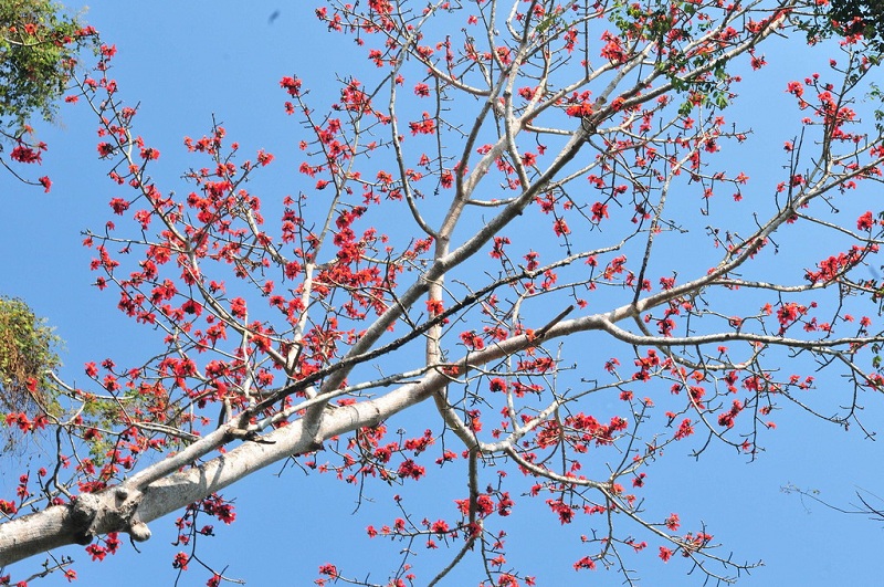 咦,春天來了。這粗糙且?guī)Я龃痰能|干,干枯的樹枝,雖然挺拔,但總歸突顯蒼老。不曾想,這毫不起眼的枯樹,卻在這春意盎然的雨天,綻放出火焰般的生命,這突如其來的綻放似那騰空而起的煙花,一樣的耀眼卻不一樣的安靜。駐足凝視,這碗大的花朵,恰似染紅的羽毛球,五片擁有強勁曲線的花瓣,包圍一束綿密的黃色花蕊,收束于緊實的花托。此花素而不艷、嫩而不嬌、爽而不躁,撩我心弦,卻道不出為何花。心動而好奇,好奇而愕然。路人甲“哎,那是木棉花,英雄花”。驚愕,卻也高興,雖不識廬山,但總歸能為其巍峨、壯麗而吸引。
