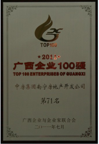 728,廣西企業(yè)與企業(yè)家聯(lián)合會(huì)在桂林發(fā)布了2011年廣西100強(qiáng)企業(yè)名單,中房集團(tuán)南寧房地產(chǎn)開(kāi)發(fā)公司榮登2011廣西企業(yè)百?gòu)?qiáng)榜,名列第71位。